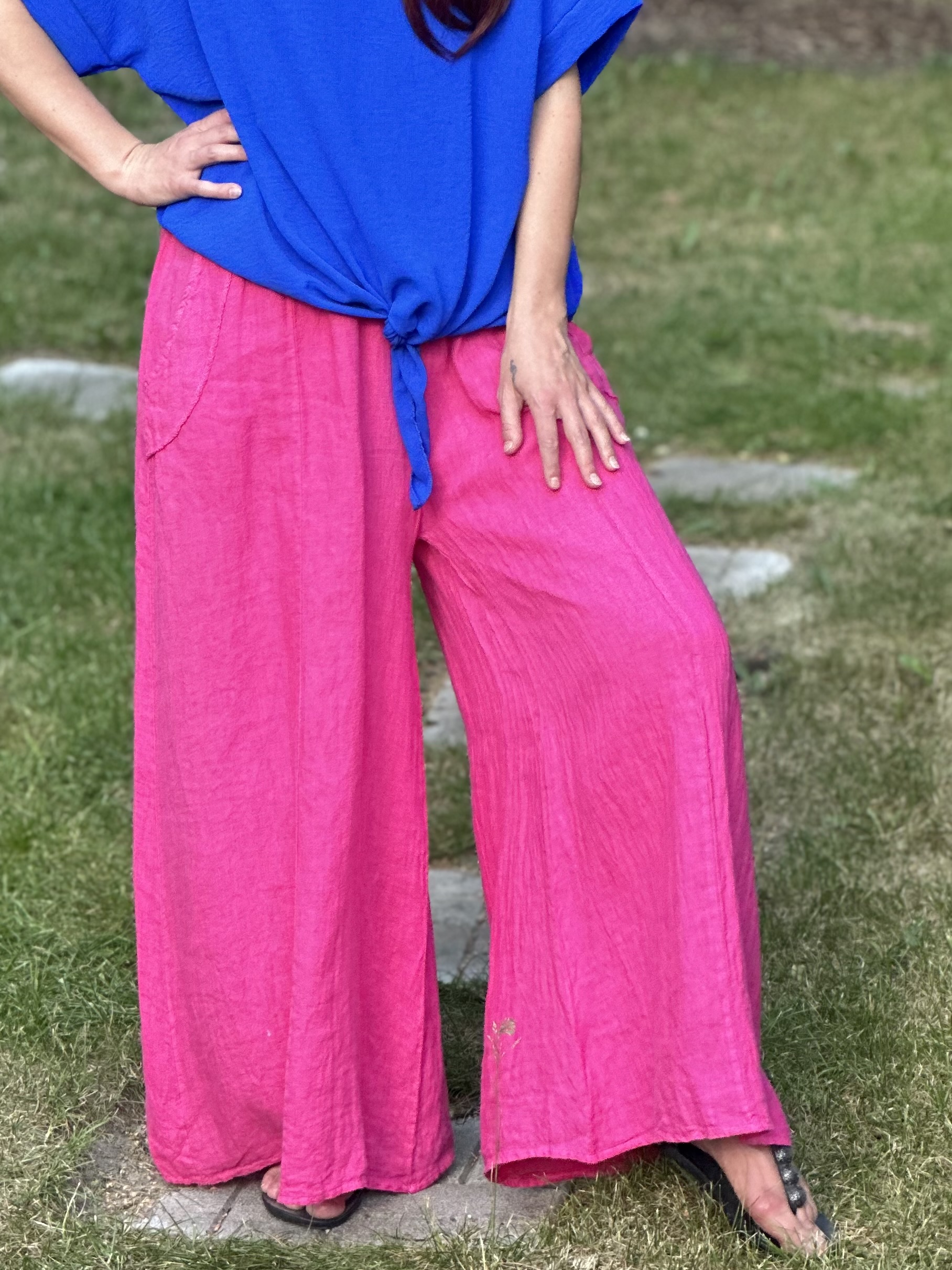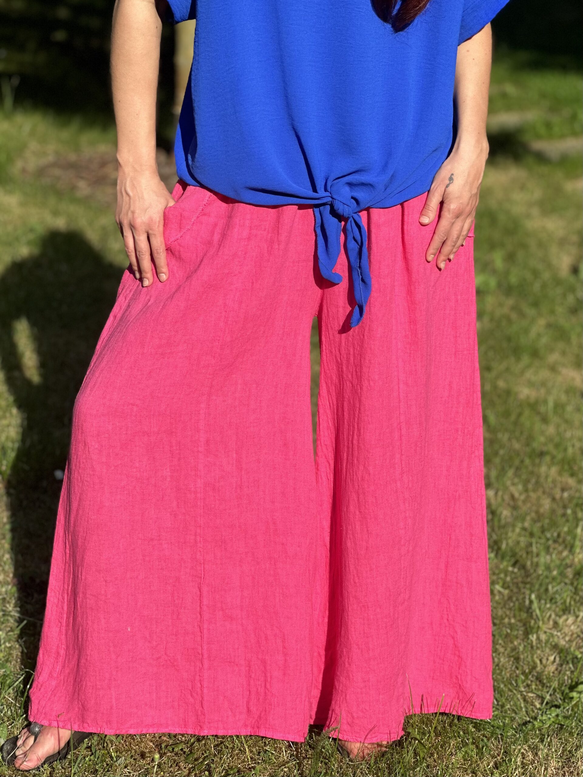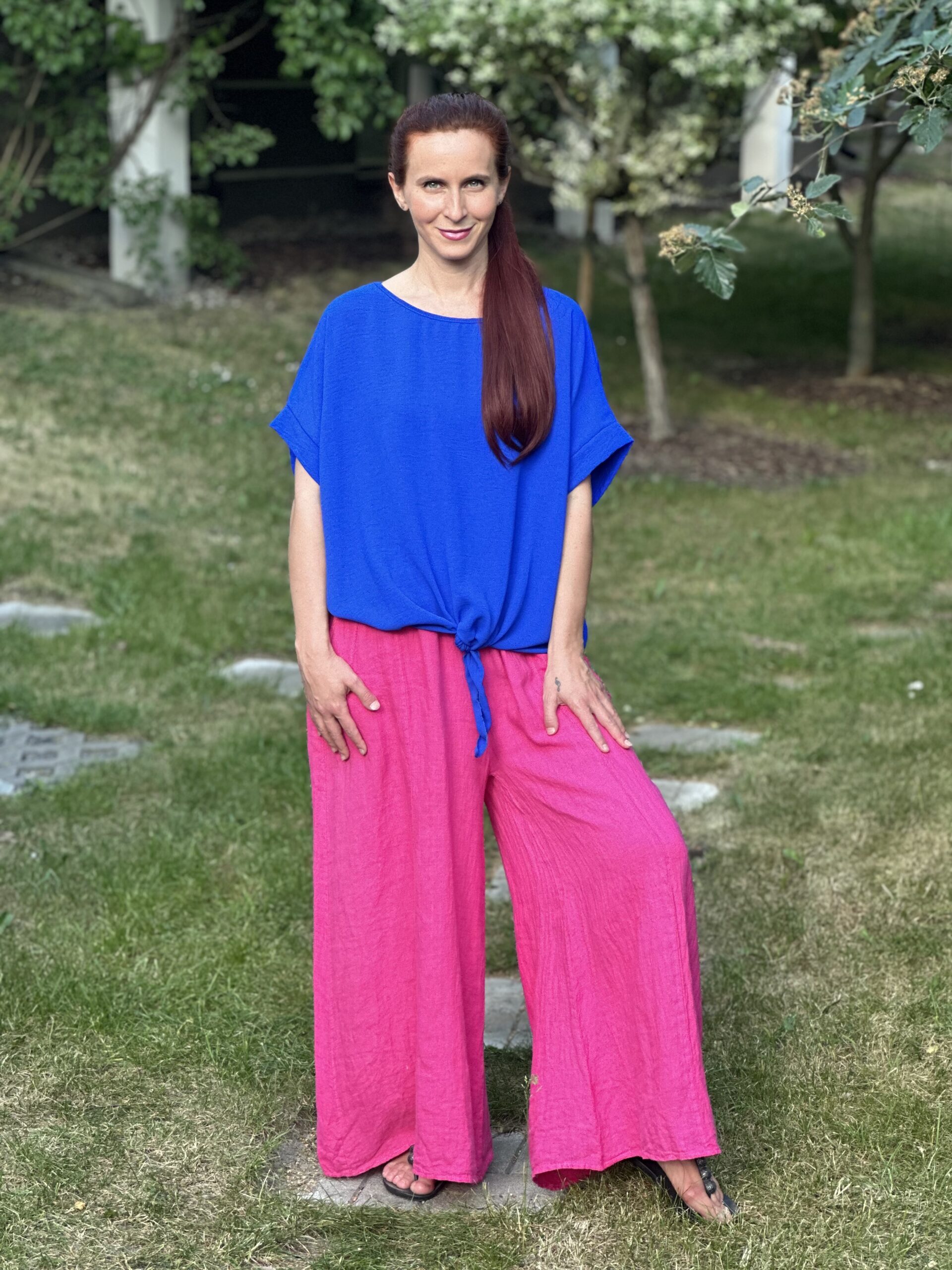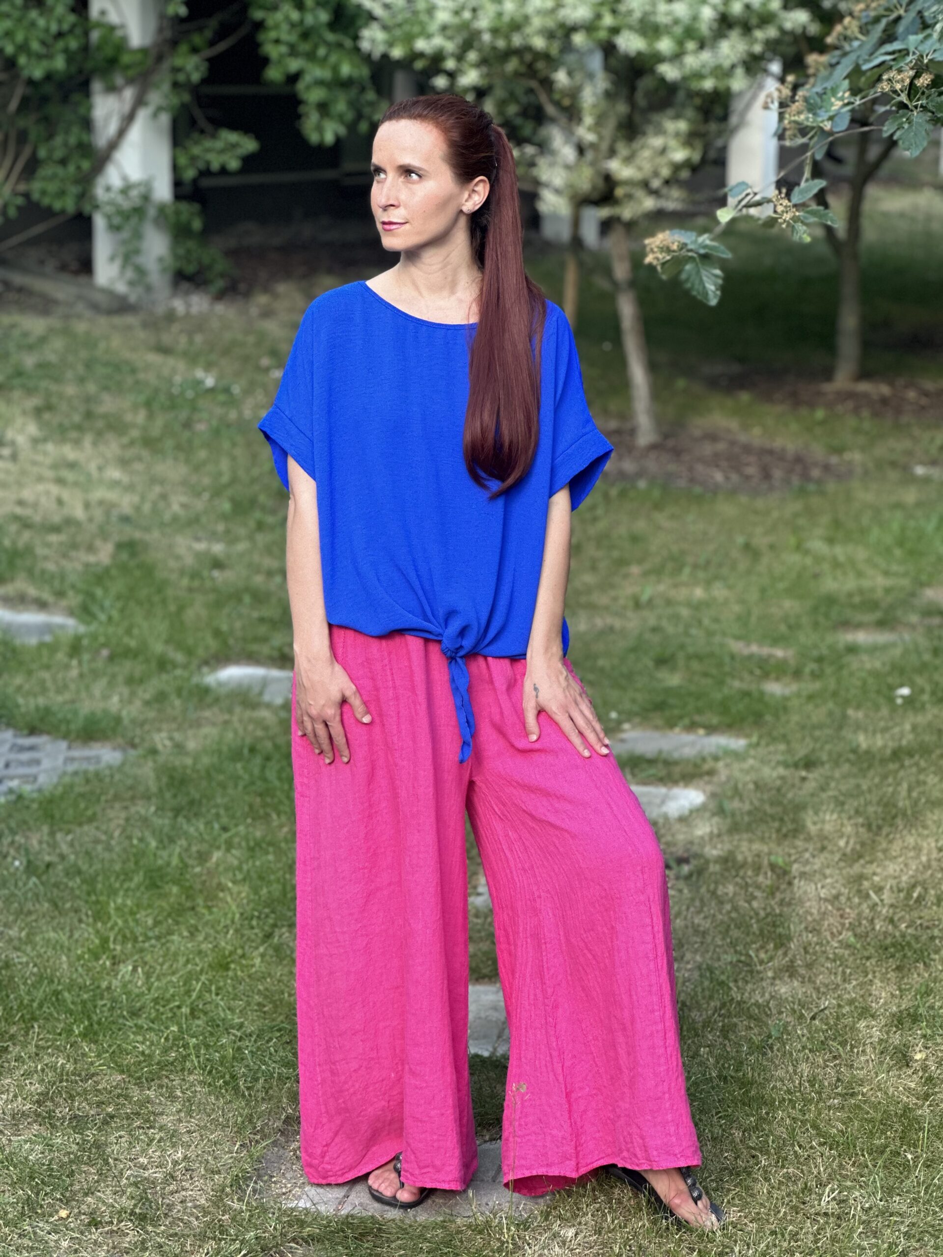 Spodnie Na Luzie są całkiem luźne i po prostu.. fajne 😉 Będą to prawdopodobnie najbardziej uwielbiane i najwygodniejsze spodnie jakie kiedykolwiek założysz. Materiał przyjemny, w sam raz na wakacje, bo to po prostu nic innego jak 100% len. Rozmiar uniwersalny, jednak przed zakupem polecamy zapoznać się z tabelą wymiarów, gdyż len sam w sobie nie jest materiałem elastycznym. Najbardziej znacząca będzie Twoja szerokość w biodrach, natomiast góra na wysokości talii i pasa nieco się dopasowuje, dzięki temu, iż uszyta jest z wiskozy z dodatkiem elastanu 🙂
