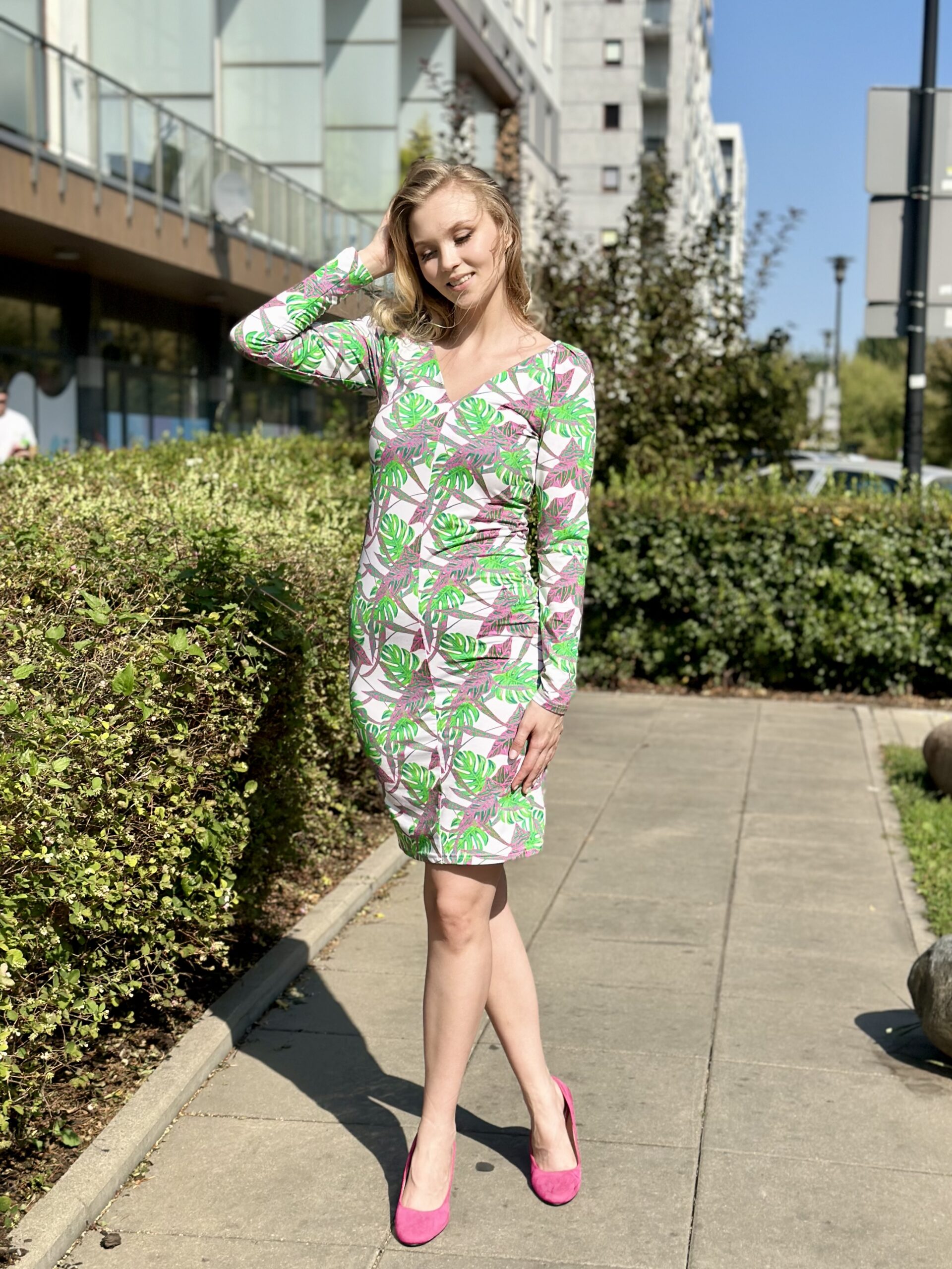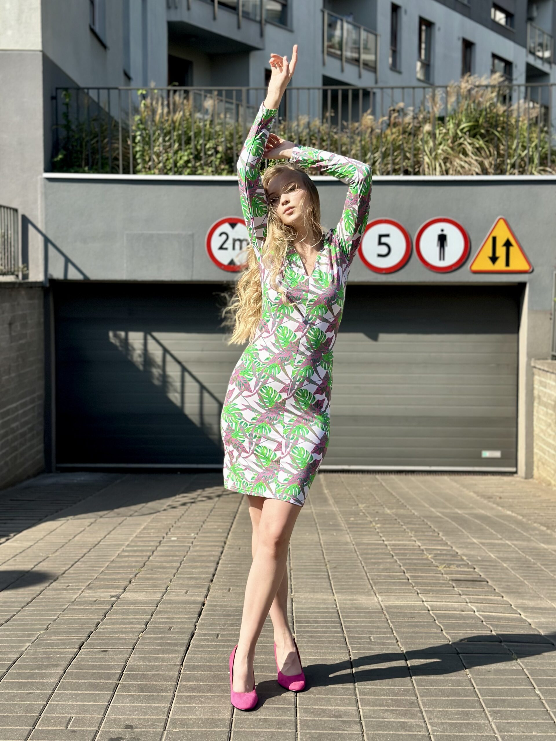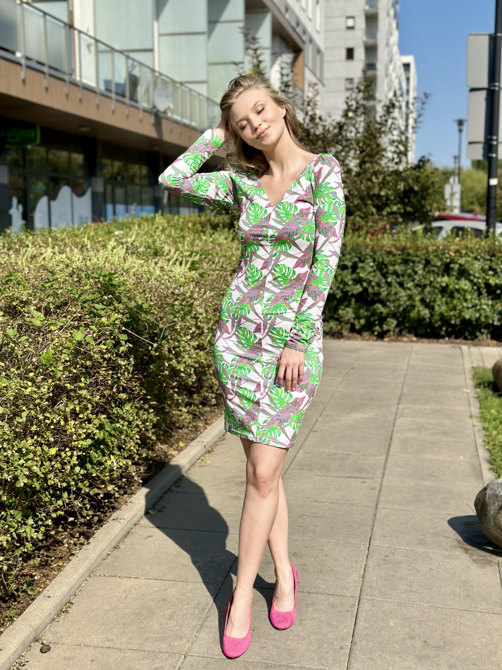 To sukienka dla kobiet lubiących podkreślić co nieco swoje kształty 😉  Na dekolcie i na plecach posiada intrygujące wycięcie, aby dodać jeszcze odrobinę więcej charakteru. Sprawdzi się na jesień, wiosnę i na letnie wieczory. Najlepiej założyć do niej szpilki, choć fajnie wygląda też na sportowo z trampkami (jeśli cenisz sobie wygodę i luz) 😉   Dostępna również w kolorze mlecznego amarantu i radosnej zieleni.   W celu dobrania rozmiaru zajrzyj do naszej tabelki z opisem, a w razie wątpliwości skontaktuj się z nami 🙂 Do tego modelu sukienki polecamy założyć cielistą bieliznę.