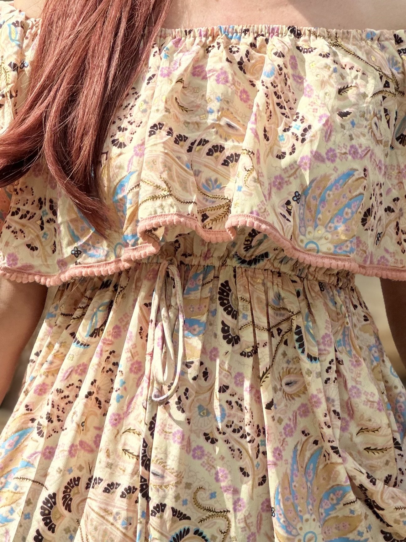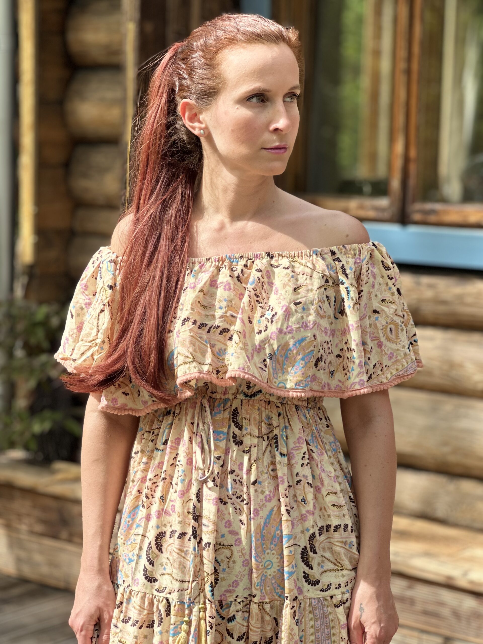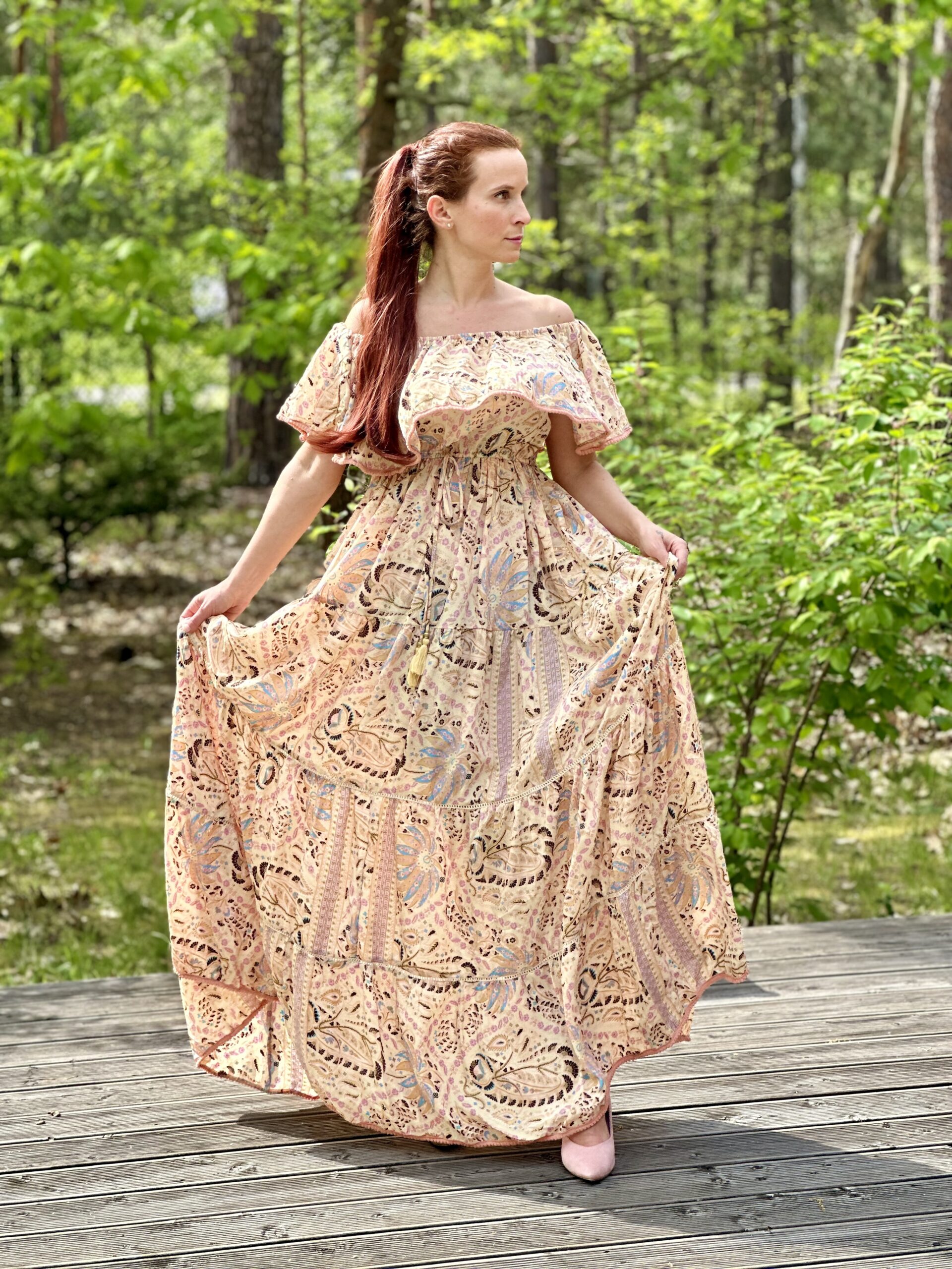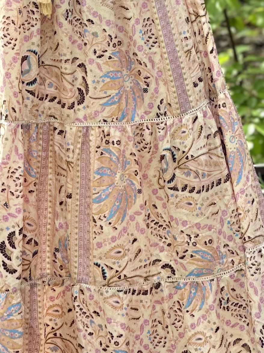 Sukienka one size o przepięknym kwiatowym delikatnym princie na kremowym tle. Niezwykle kobieca i subtelna. W talii posiada gumeczkę i troczek, które podkreślają dodatkowo linię biustu. Dół jest rozłożysty, składający się z doszywanych do siebie coraz szerszych falban. Sukienka uszyta jest z przewiewnego indyjskiego jedwabiu.