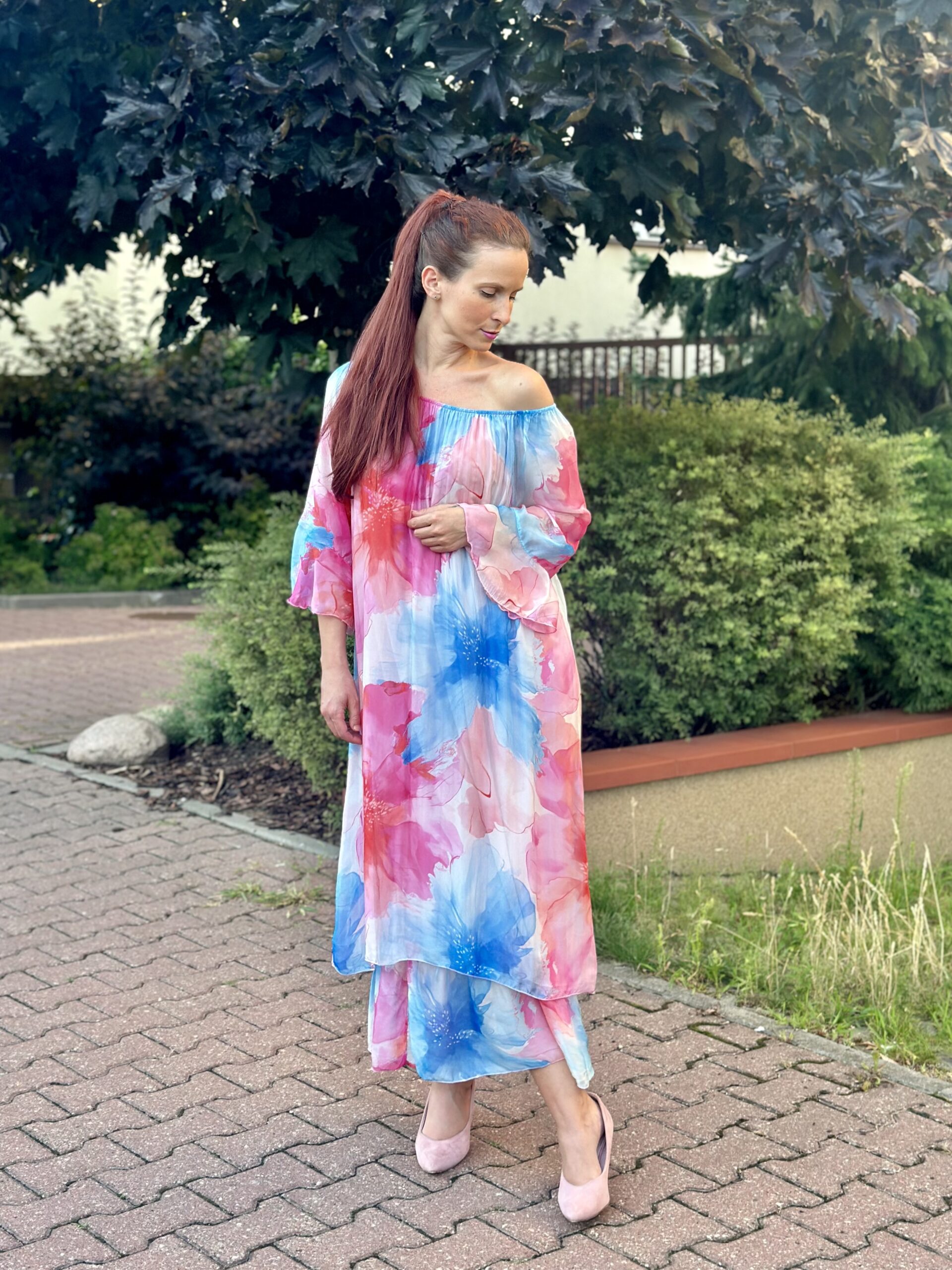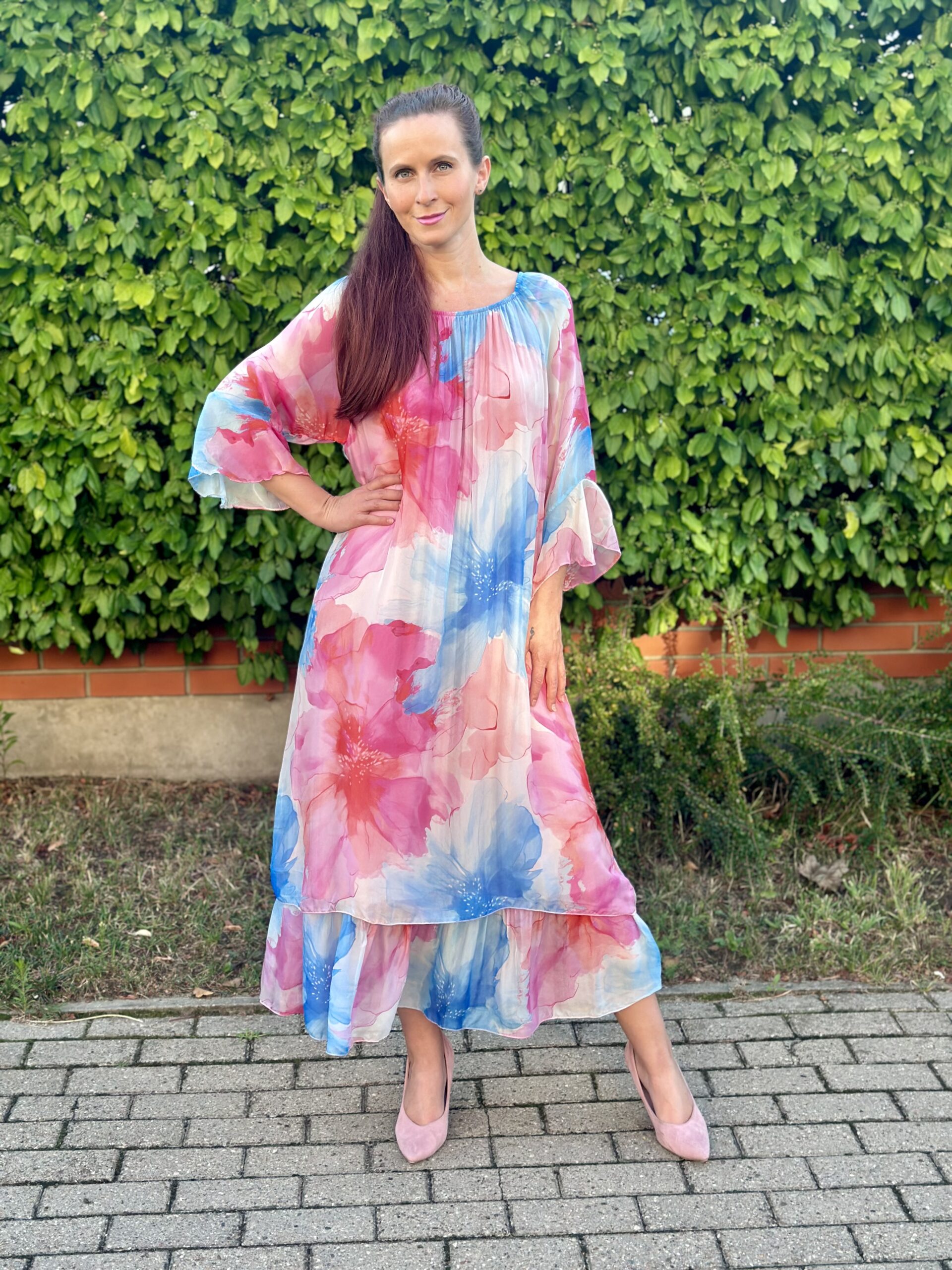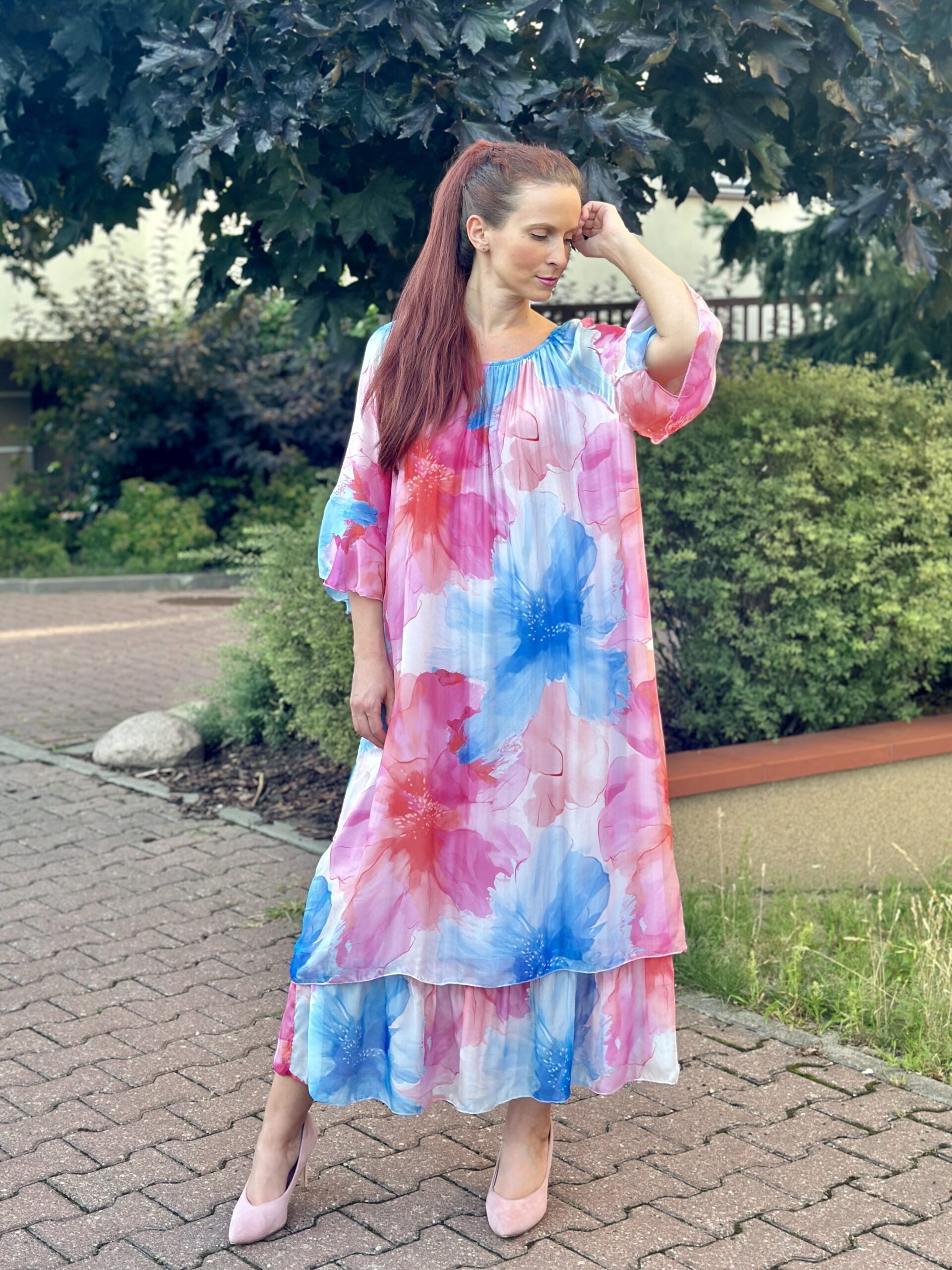 Sukienka, w której zakochałyśmy się w ułamku sekundy! Jej przepiękne kolory zachwycają i przykuwają uwagę otoczenia 🙂 Krój jest one size i można nosić ją zarówno z paskiem lub bez. Doskonała zarówno dla Pań mających rozmiar XS jak i XL. Jest zwiewna i lejąca. Pod spodem posiada halkę, więc nie musisz martwić się o prześwitywanie. Pasek nie należy do zestawu.