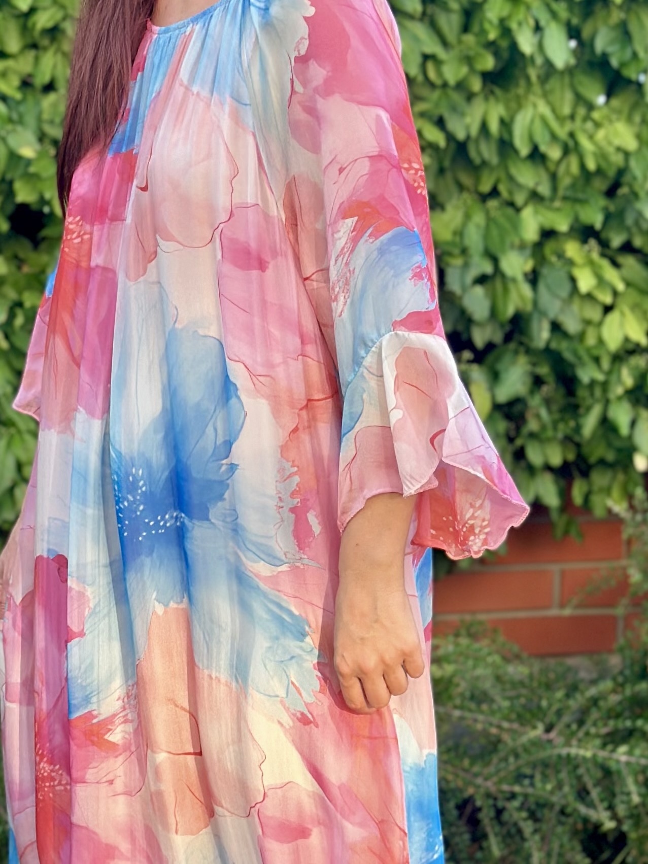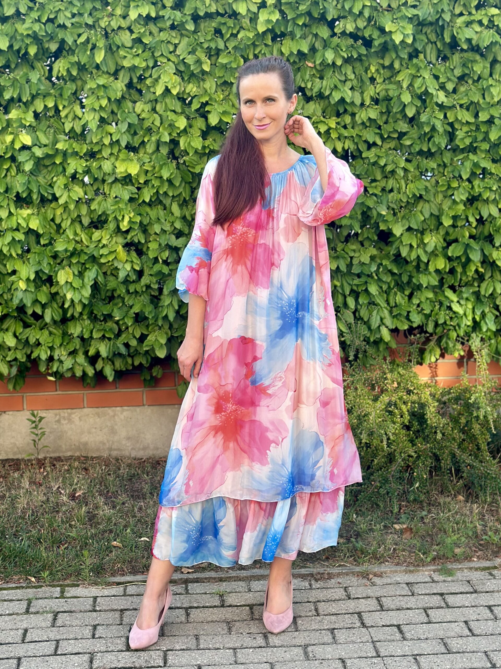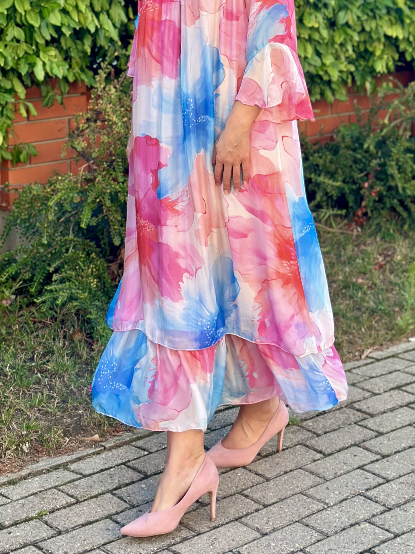 Sukienka, w której zakochałyśmy się w ułamku sekundy! Jej przepiękne kolory zachwycają i przykuwają uwagę otoczenia 🙂 Krój jest one size i można nosić ją zarówno z paskiem lub bez. Doskonała zarówno dla Pań mających rozmiar XS jak i XL. Jest zwiewna i lejąca. Pod spodem posiada halkę, więc nie musisz martwić się o prześwitywanie. Pasek nie należy do zestawu.