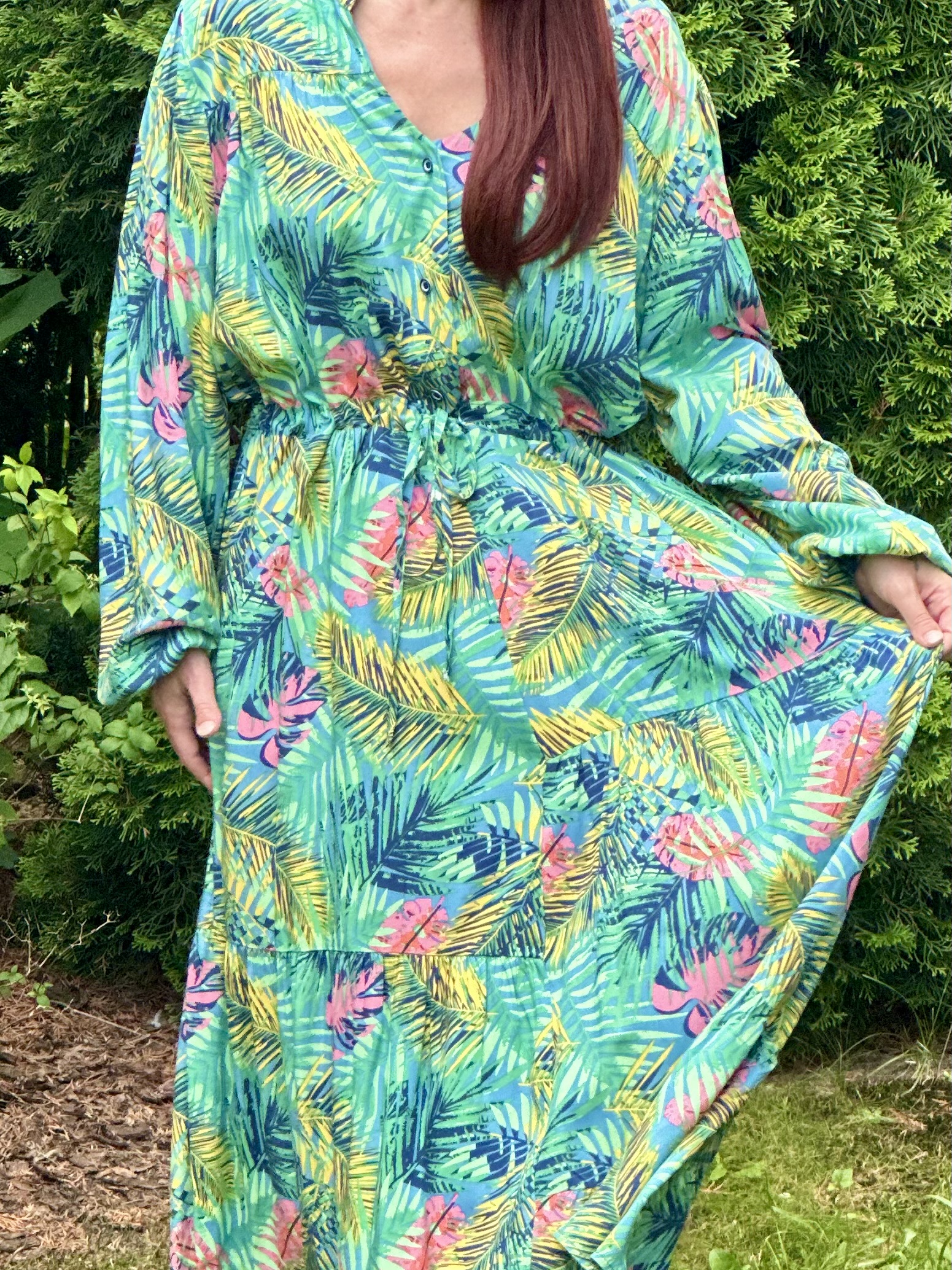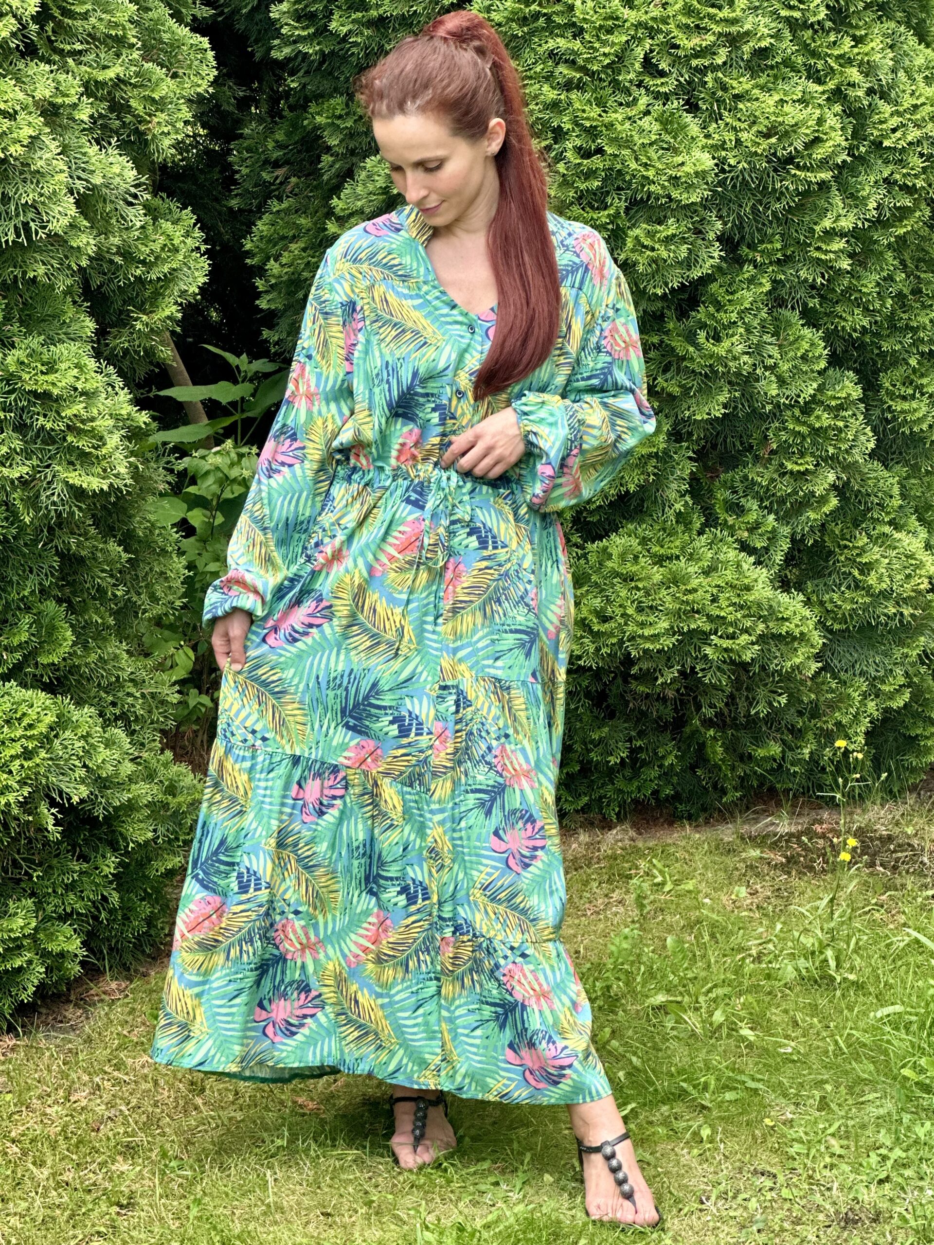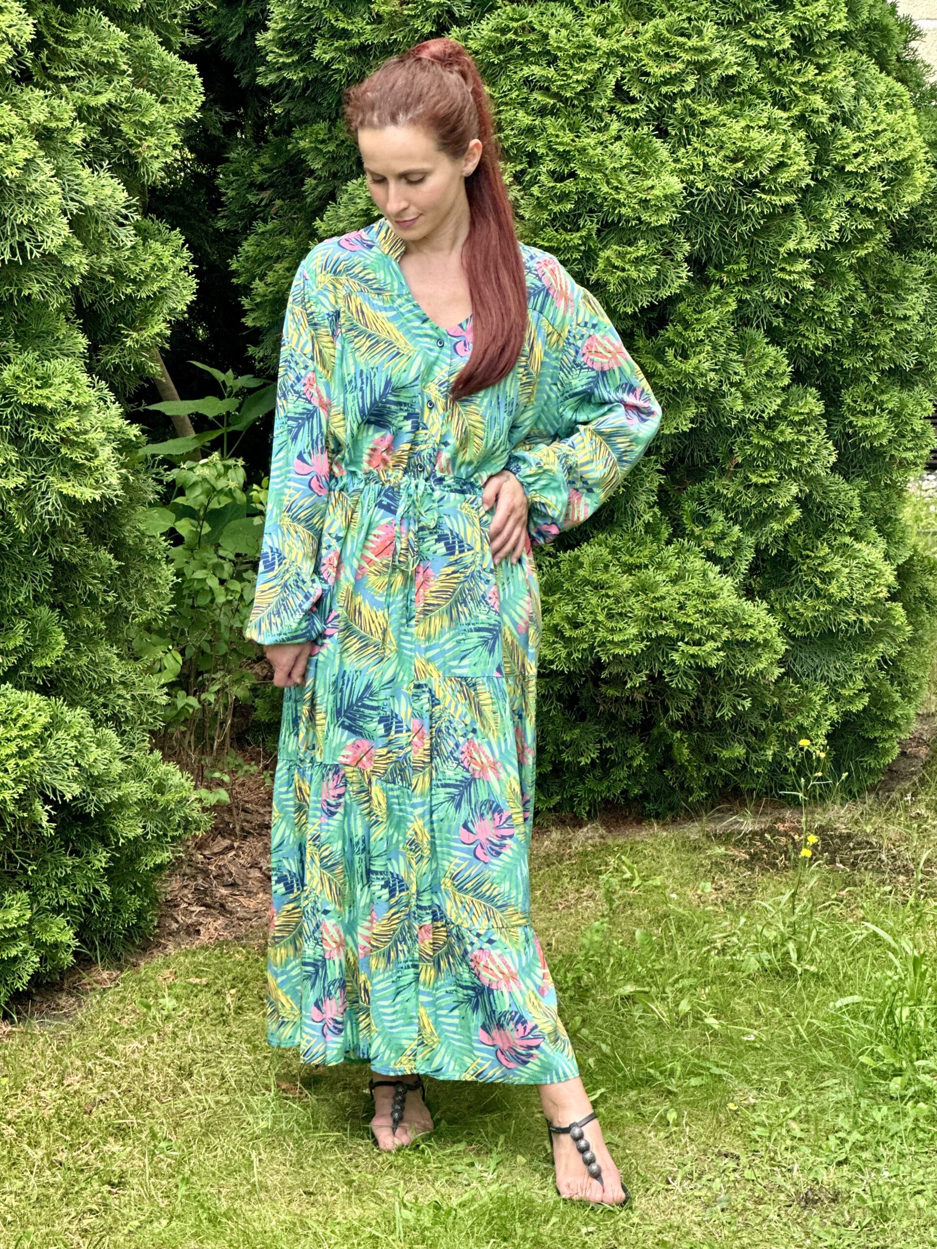Sukienka, która ma dużo zalet! 🙂 W pasie ma elastyczne wiązanie, jest zapinana na guziki i leciutka. Mankiet rękawa posiada gumeczkę, więc możesz go wygodnie podwijać. Dostępna w dwóch rozmiarach, zarówno dl większych pań jak i na mniejsze rozmiary – wystarczy, że zawiążesz ją lżej bądź mocniej w talii 🙂 Rozmiar 1 ma na wysokości biustu aż 120 cm, a rozmiar 2 nawet ok. 132 cm, więc pomieści naprawdę sporo 🙂 Dokładne wymiary poniżej.