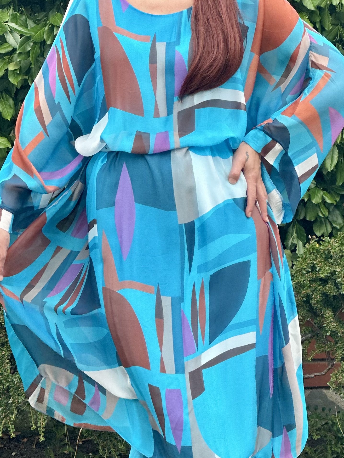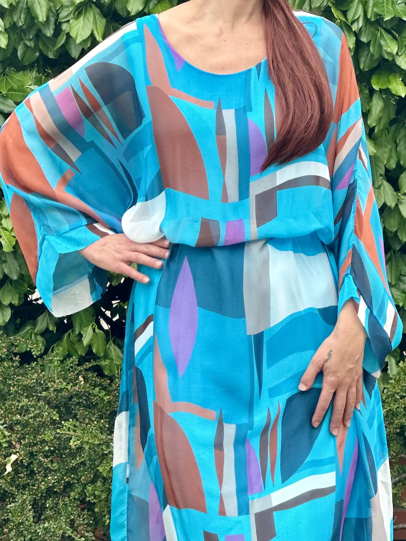 Skład sukienki: 100% jedwab indyjski Skład halki: wiskoza z elastanem Wymiary sukienki: Szerokość pod pachami 100x2 cm Szerokość na dole 95x2 cm Długość całkowita przód 118 cm Długość całkowita po bokach 127 cm Wymiary halki: Szerokość pod pachami 45-53x2 cm Szerokość w pasie 44-52x2 cm Szerokość w biodrach 50-58x2 cm Długość całkowita 109 cm