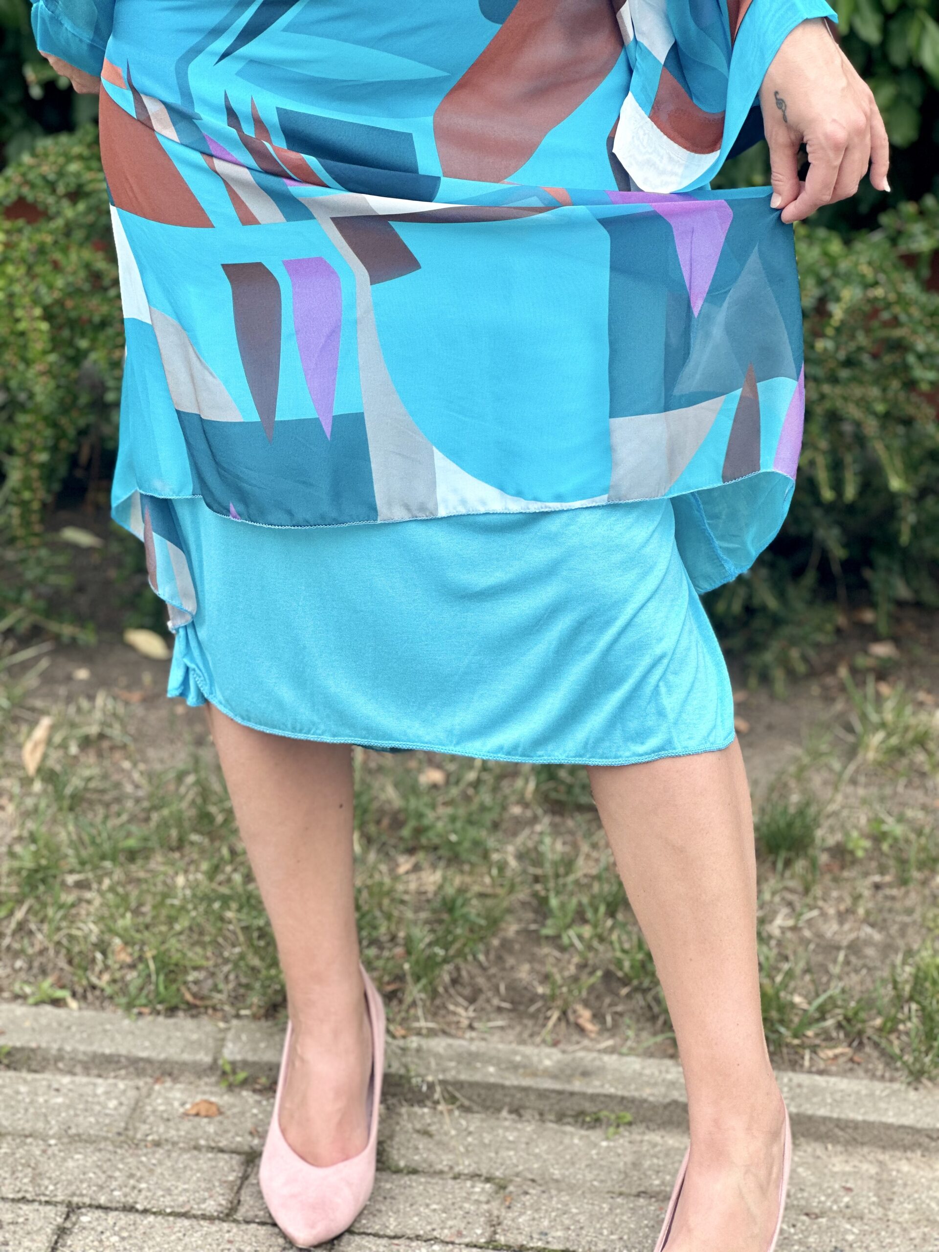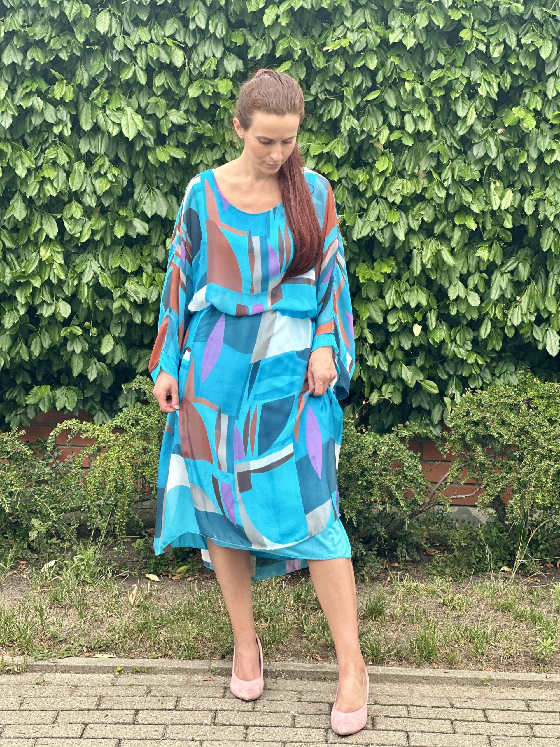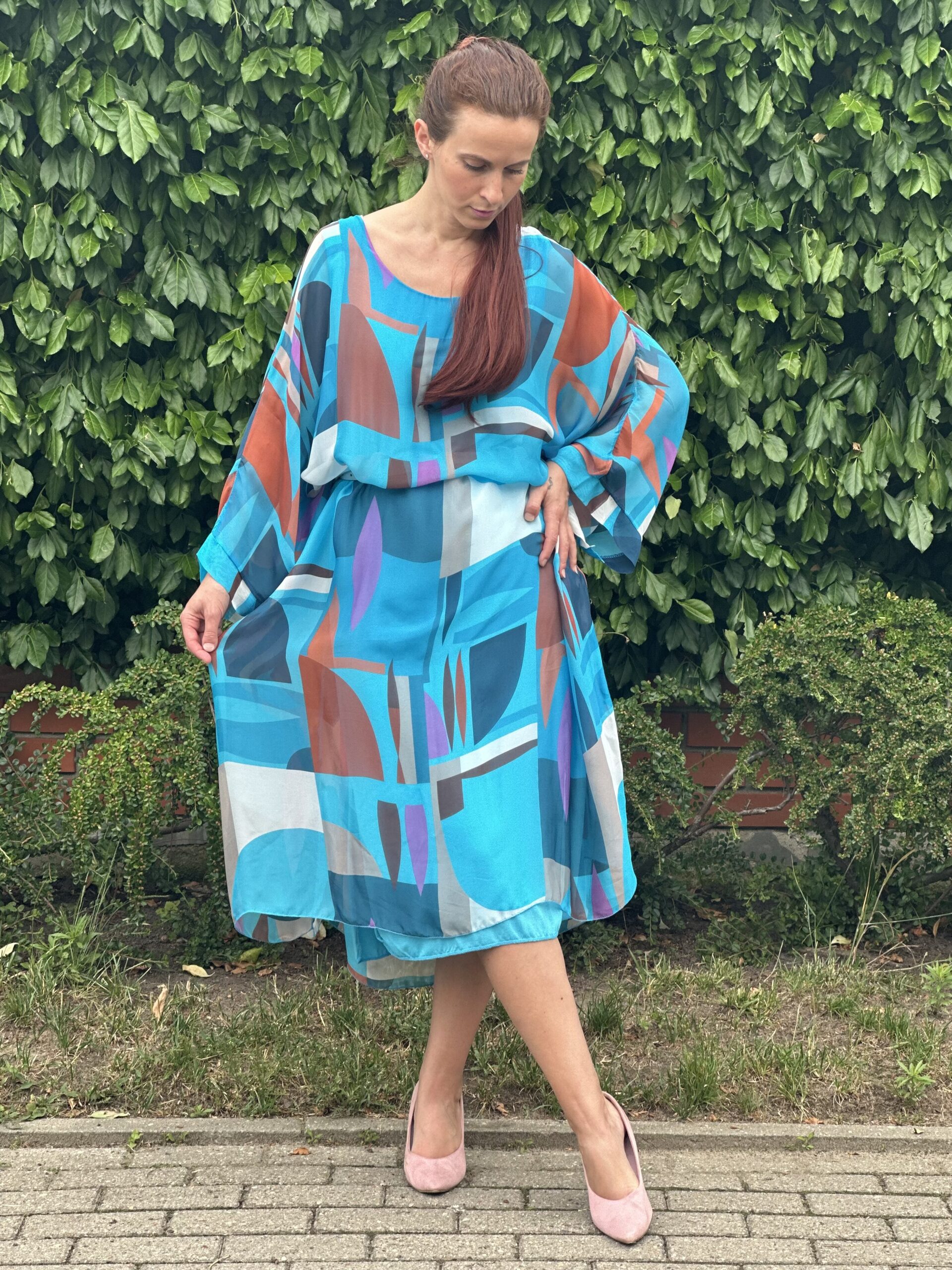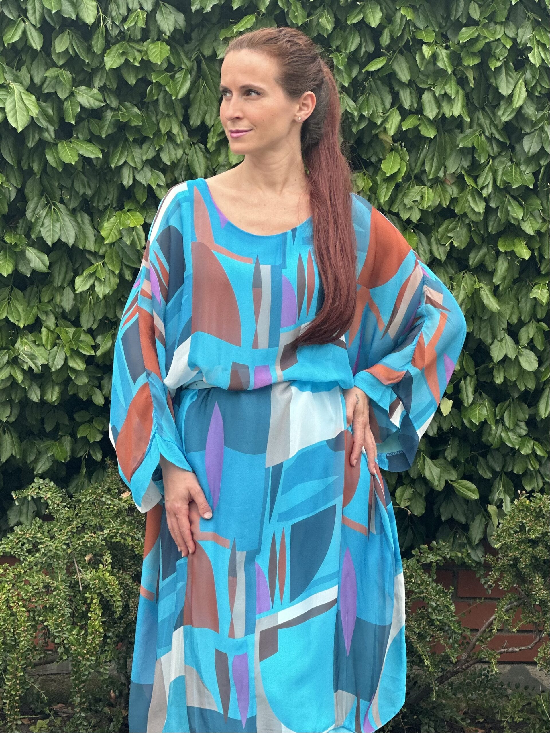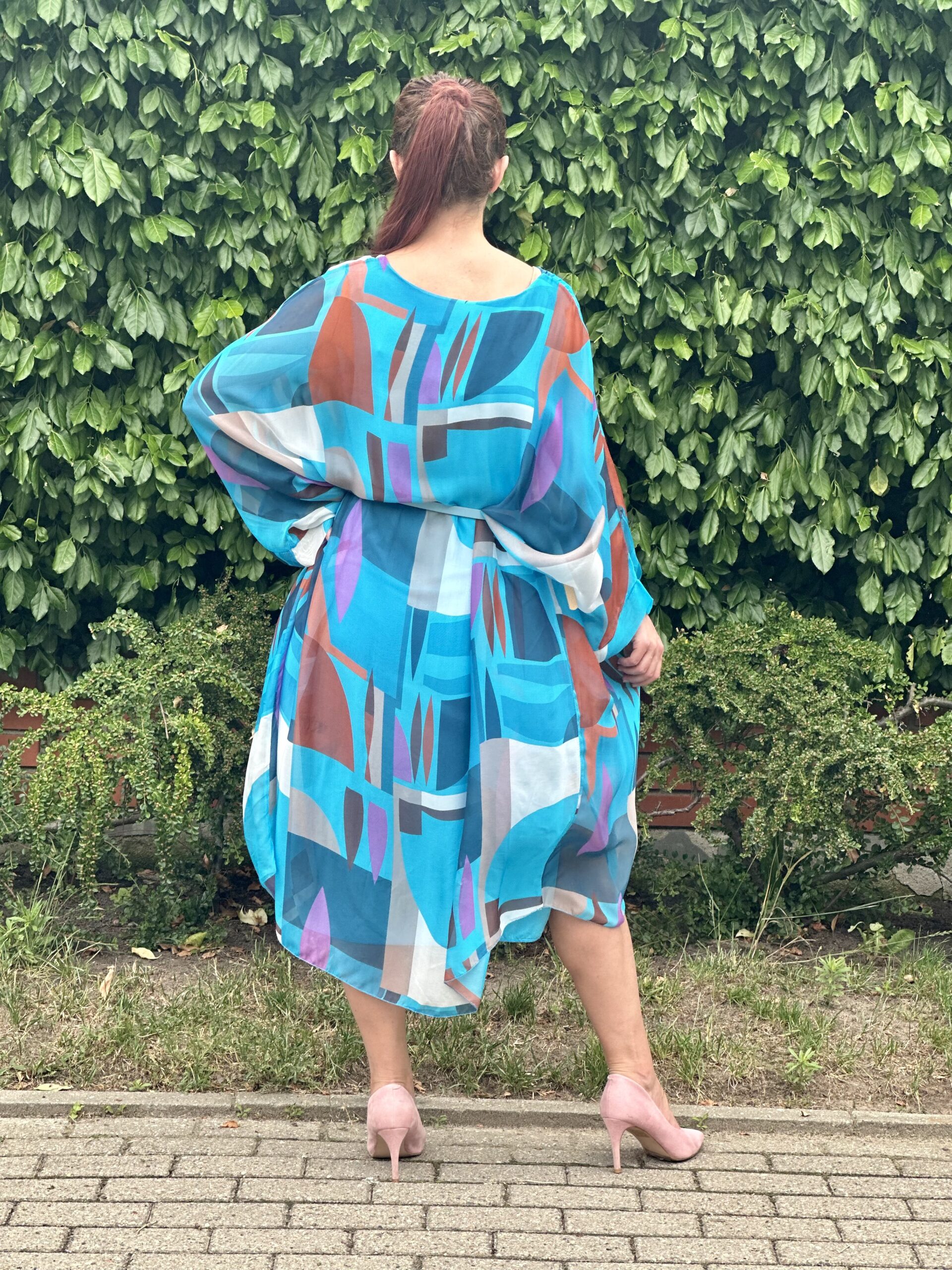 Krój oversizowy. Bardzo luźna i przewiewna. Pod spodem ma wszytą elastyczną turkusową halkę. Idealna zarówno dla Pań plus size jak i na mniejsze rozmiary.