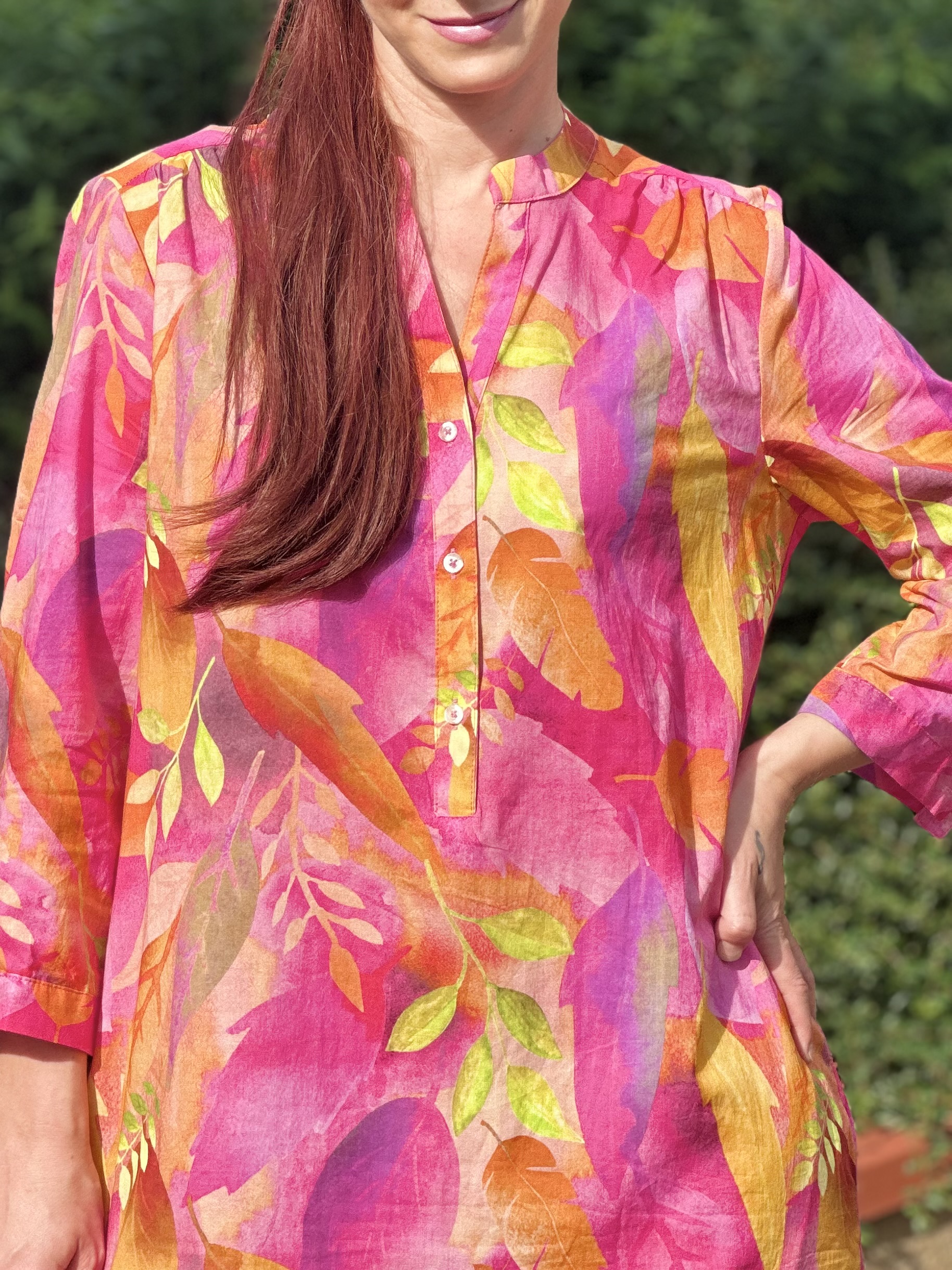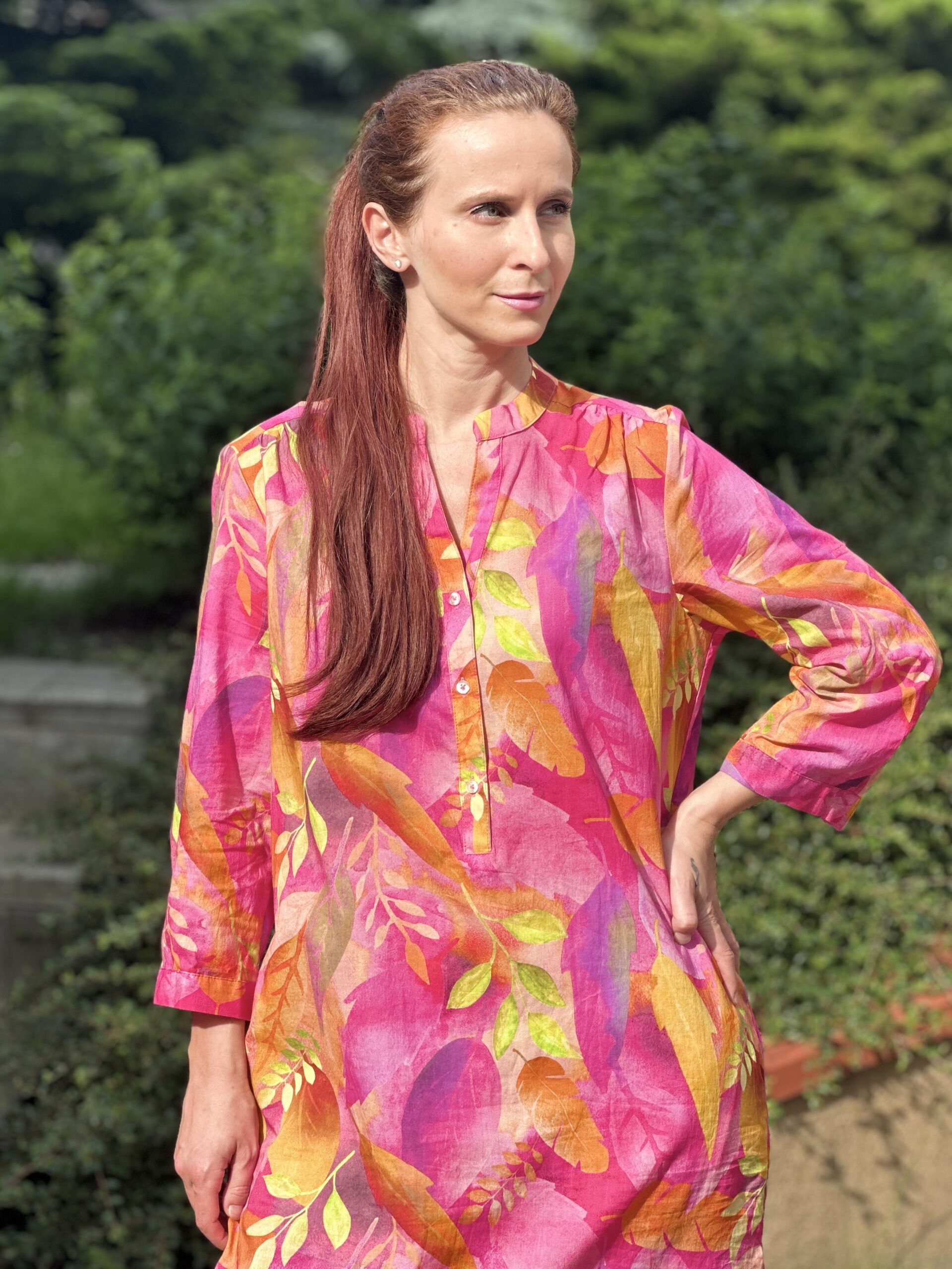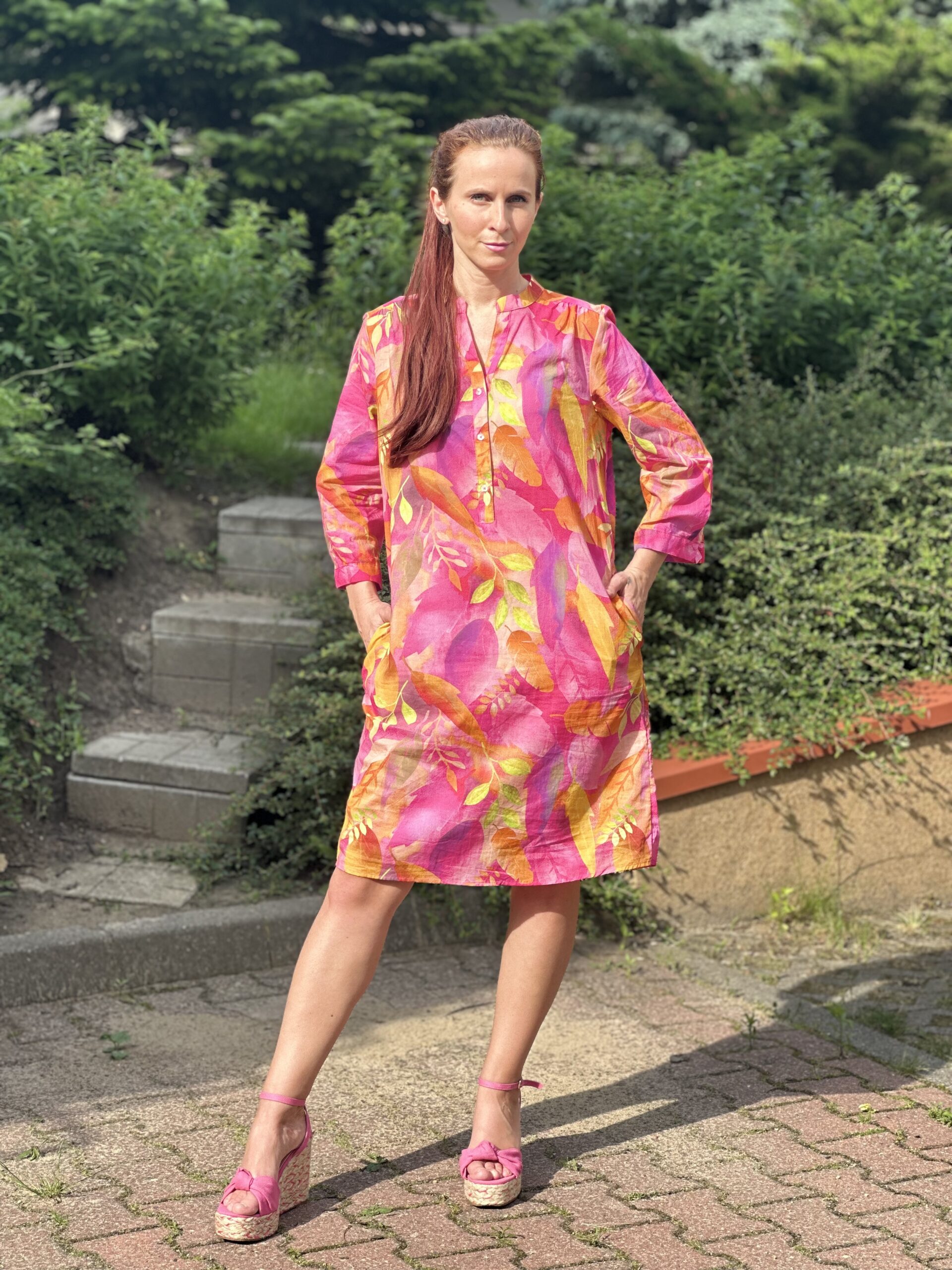 Lekka, przewiewna sukienka z tkaniny. Od góry zapinana na guziki aż do pasa. Rękawki można wywijać i zapinać na guzik 🙂