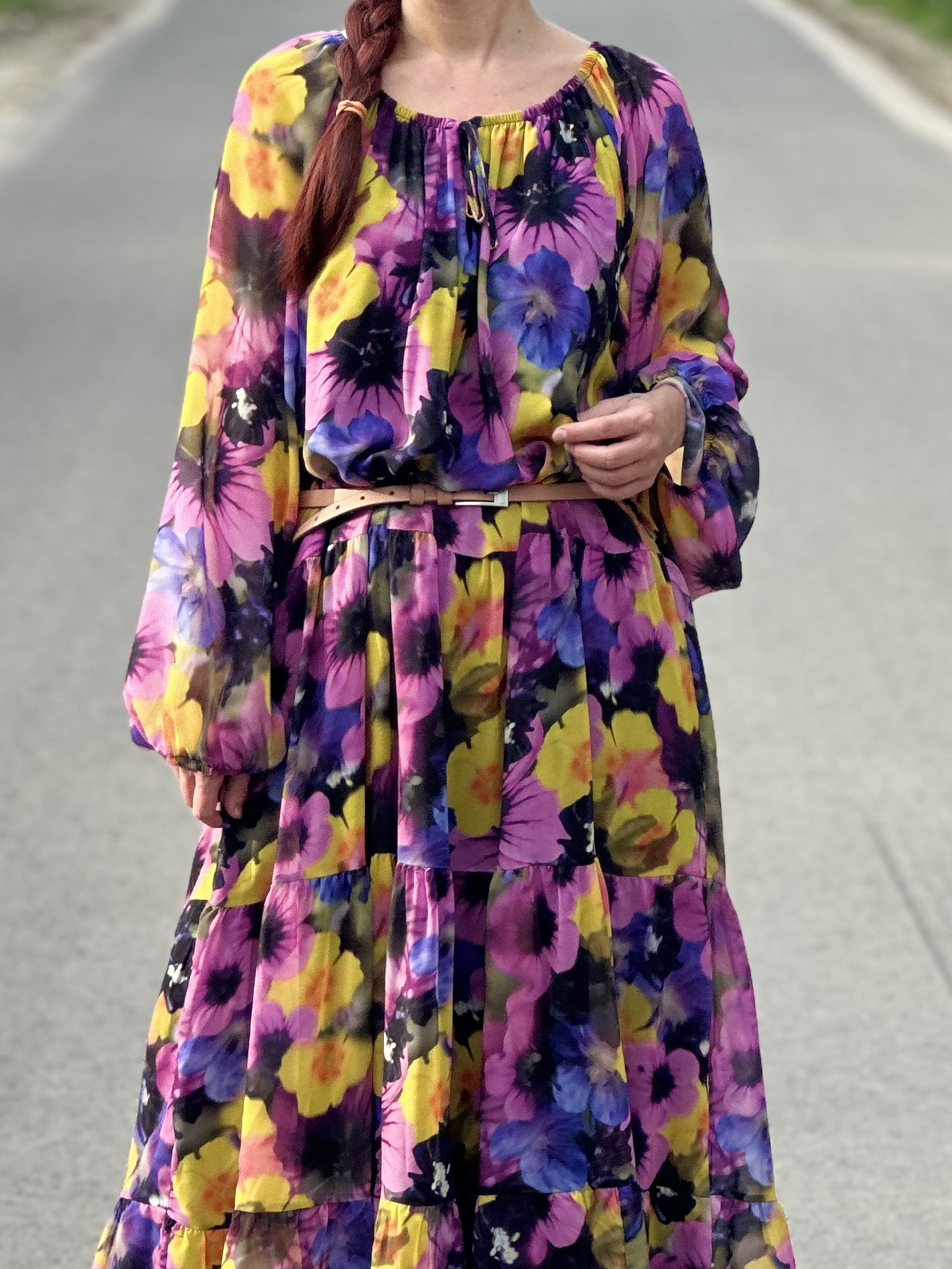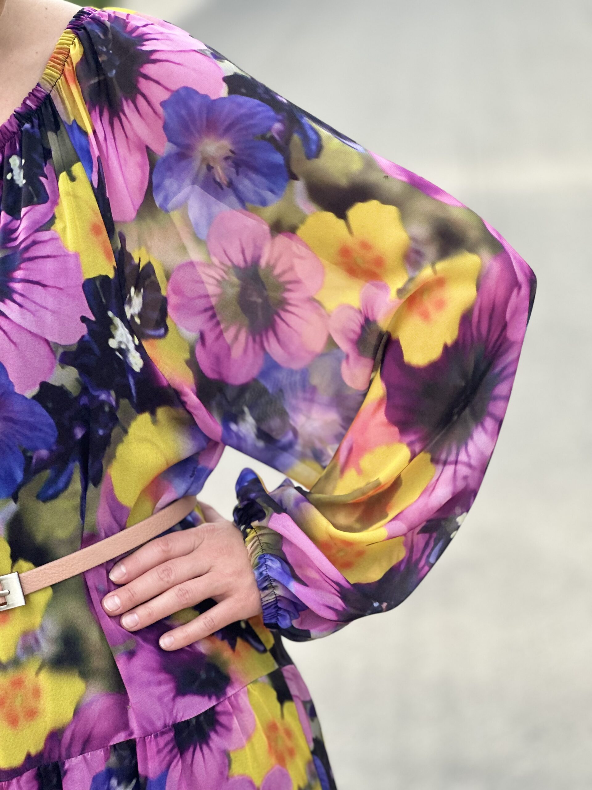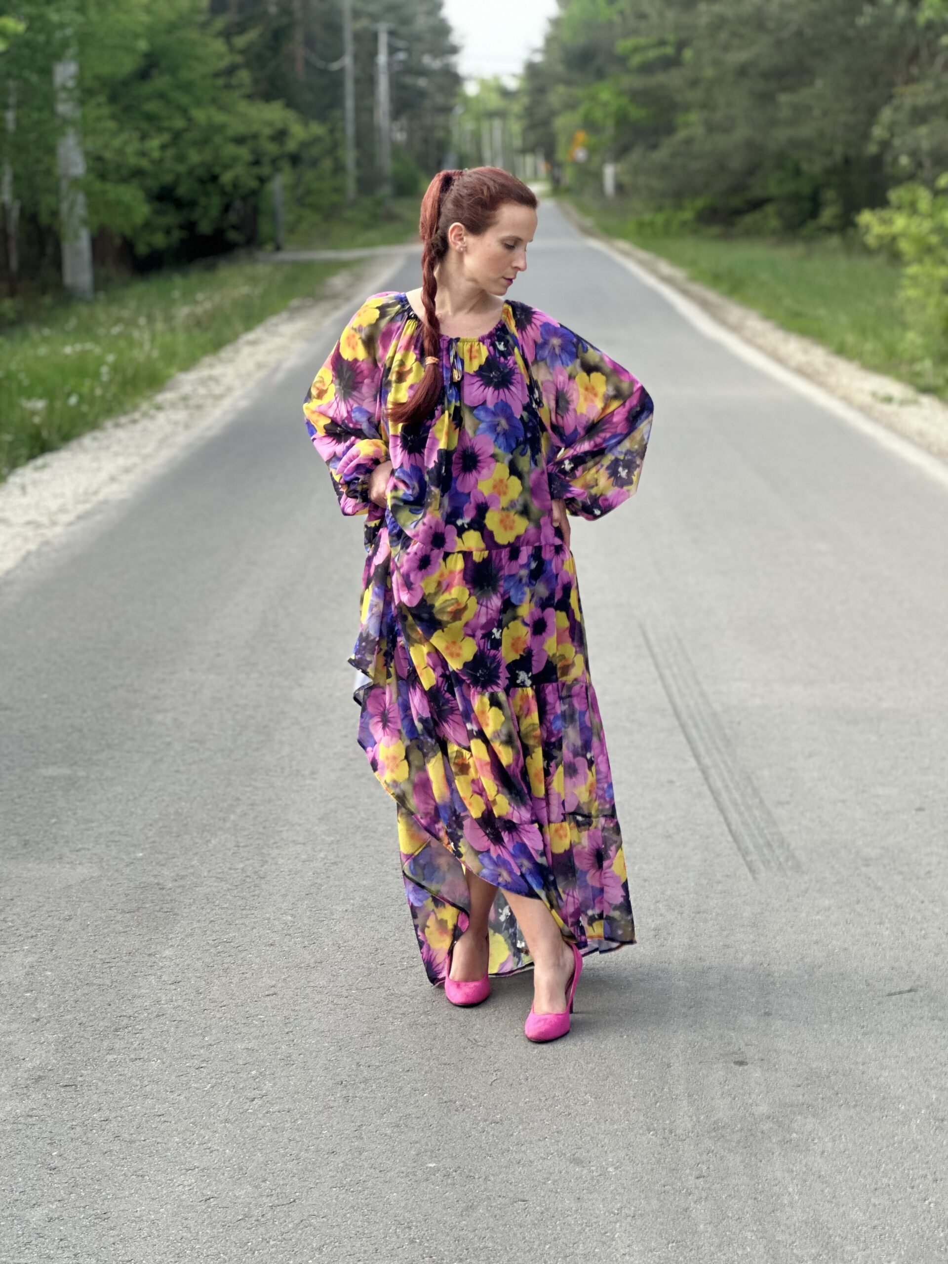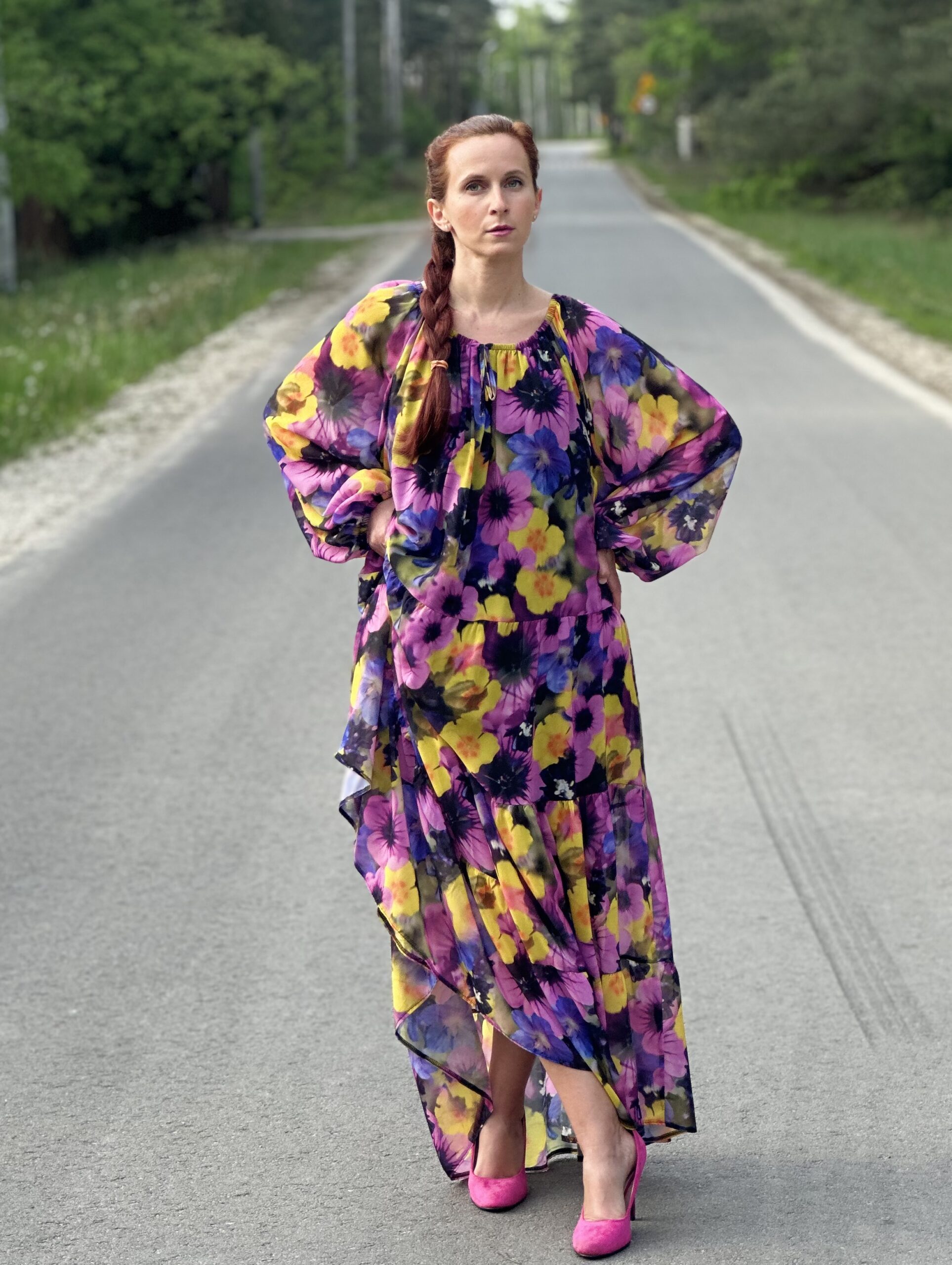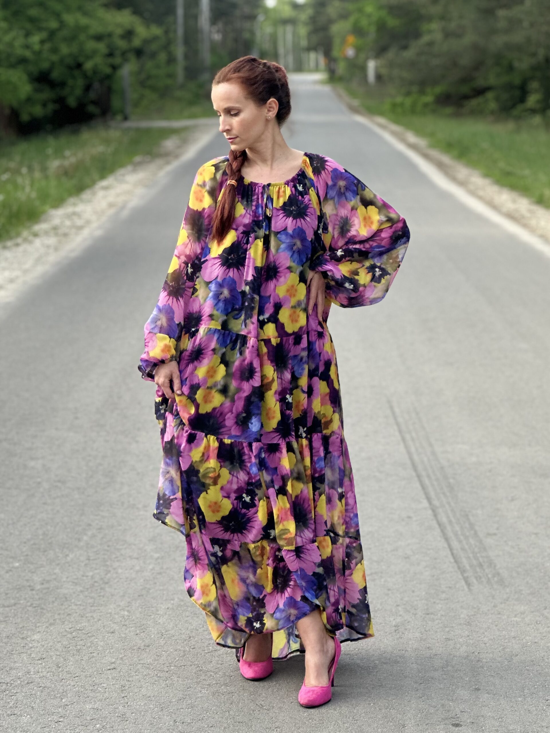 Sukienka Vina wykonana jest ze zwiewnego lekkiego szyfonu. Rozszerza się ku dołowi, a pod spodem posiada czarną halkę. Jest idealna dla kobiet plus size, jednak można ją również śmiało nosić będąc S-ką lub M-ką, obwiązując się dodatkowo paskiem na wybranej wysokości.